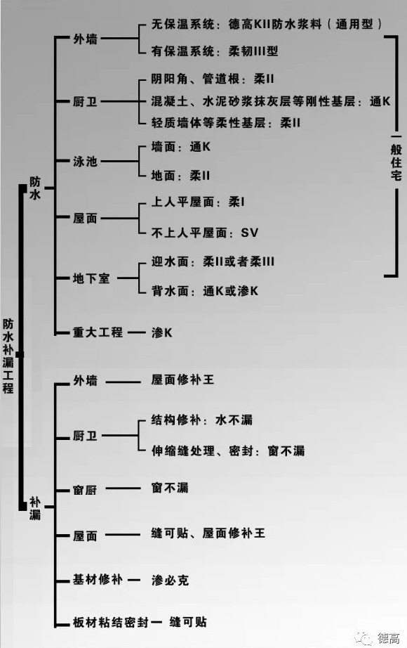 廚房、衛生間、陽臺、外墻、天臺、地下室、泳池等德高防水產品使用推薦方案,供大家參考!有了這張表什么地方用什么德高防水產品一目了然,不用再迷茫啦。