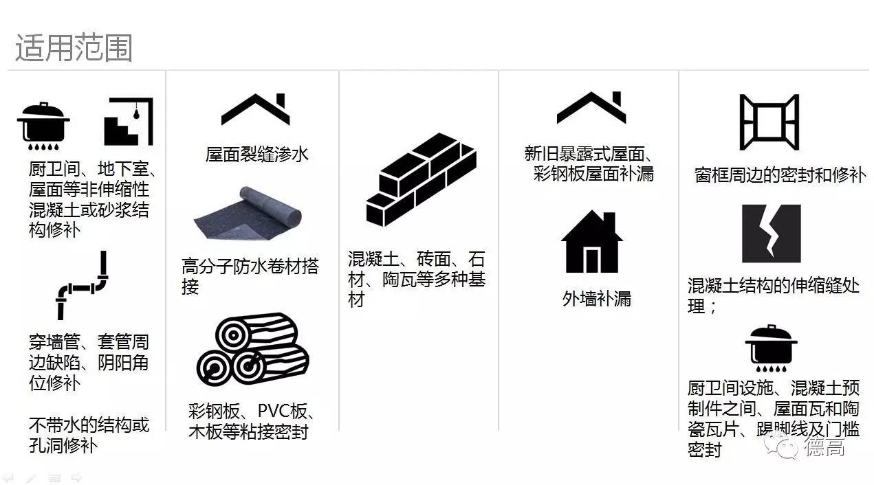 【概要描述】Q:明明按照標準步驟施工還是會漏水?A:產品沒選對,怎么做都是錯的呀!?Q:需要防水保護的部位有點多,可否一款產品全搞定?A:沒有萬能藥,又怎會有一招平天下的防水!?