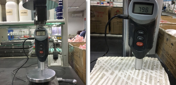 在現場我們可以通過鐵釘劃刻的方式初步測試硬度,但更準確的測試方法我們可以取樣到實驗室,通過邵氏硬度計進行測試。比如德高TTBⅡ大磚瓷磚膠干固后的邵氏硬度一般為60-70,如果硬度超過80,則基本可判定為摻加了水泥。