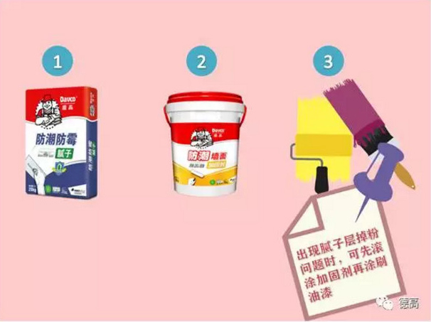 膩子層施工后出現掉粉問題時,可先滾涂德高防潮墻面加固劑,再進行1道底漆和2道面漆的施工,確保涂裝系統的質量。