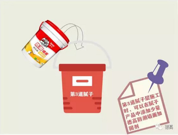 第3道膩子層施工時可在膩子產品中添加少量德高防潮墻面加固劑,增加膩子層的硬度和保水性能。