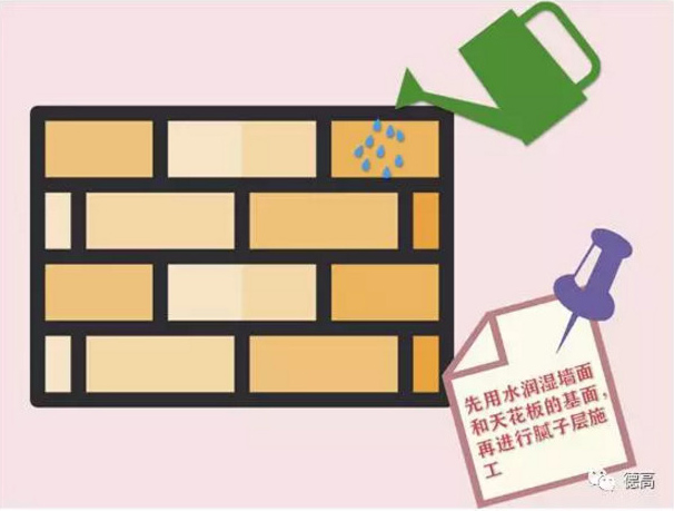 先用水潤濕墻面和天花板的基面,再進行膩子層施工。