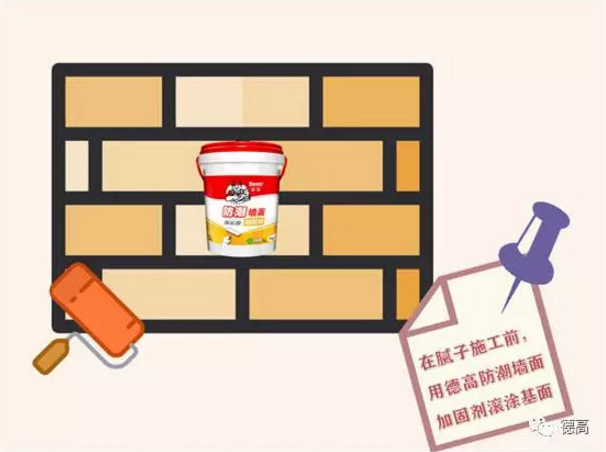 在膩子施工前,用德高防潮墻面加固劑滾涂于基面,可以降低基面吸水率,避免膩子批刮產生氣泡,增加膩子層的粘結力。