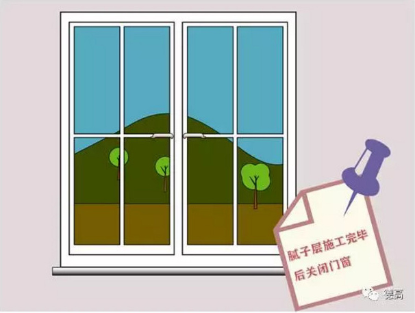 膩子層施工完畢后關閉門窗,防止通風良好帶走材料水分。