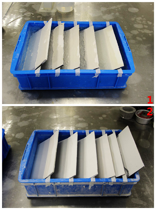觀察圖一與圖二分別浸在不同容器中的膩子板。兩容器共容納10塊膩子板,分別來自十個品牌的膩子,放置于水中的時間一致,均超過72小時。圖一容器中的是低端品牌的膩子粉,可以看出來,膩子粉大幅起泡、脫落,防水性不如圖二容器中的中高端膩子粉。