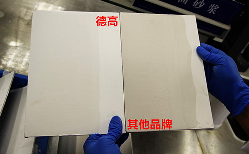 但同樣是中高端膩子粉,細看之下,仍有區別。右邊為其他品牌的膩子板,在同樣的浸泡時間與浸泡條件下,其他品牌的膩子板明顯有小氣泡,用手指觸摸之后,掉粉現象也較為明顯。