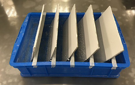圖4 膩子樣板浸水粘接強度測試樣塊浸水過程中(樣板泡水后做拉拔強度測試)