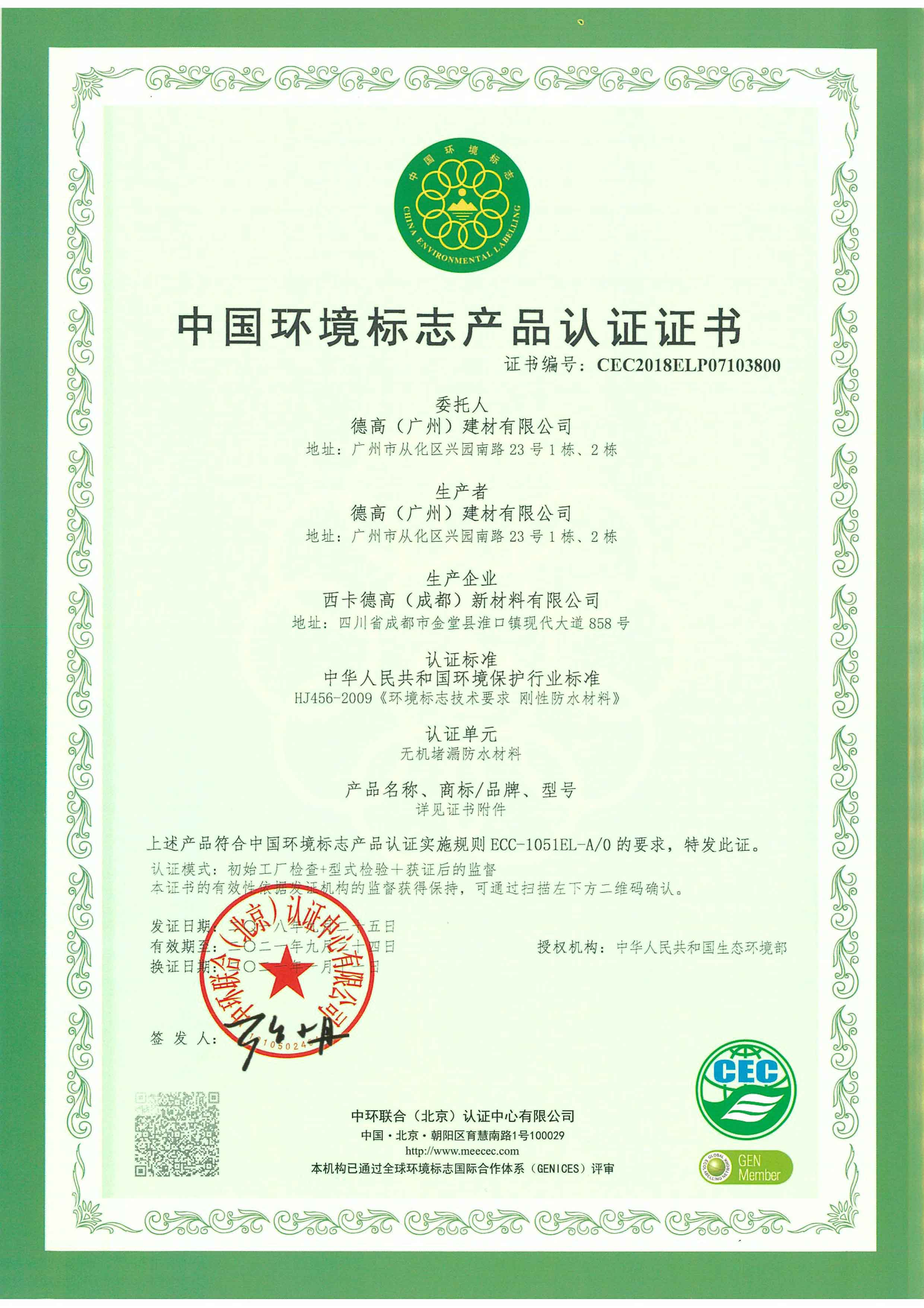 【概要描述】十環證書-成都工廠-無機堵漏防水