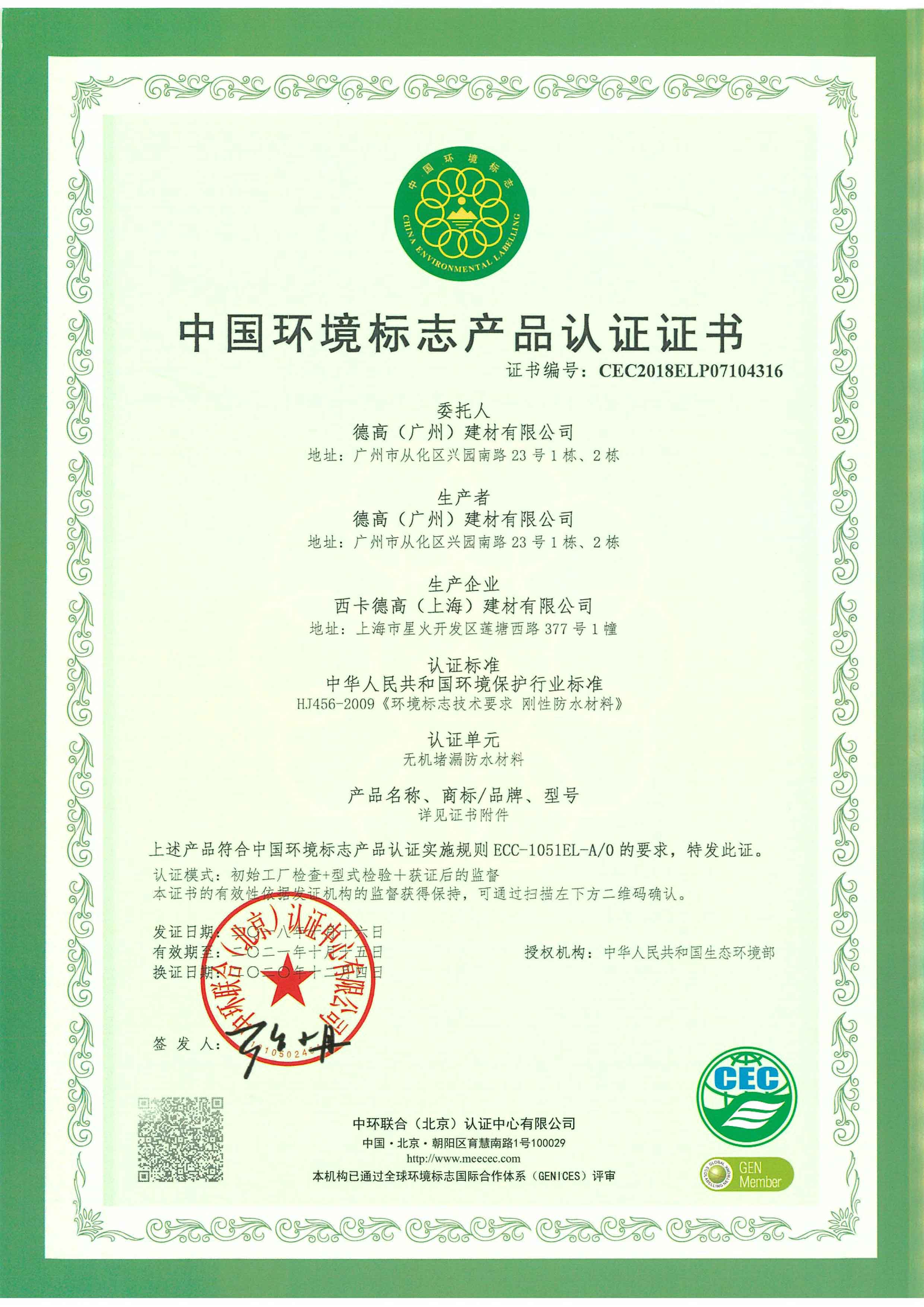 【概要描述】十環證書-上海工廠-無機堵漏防水