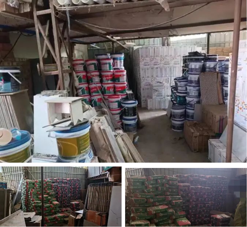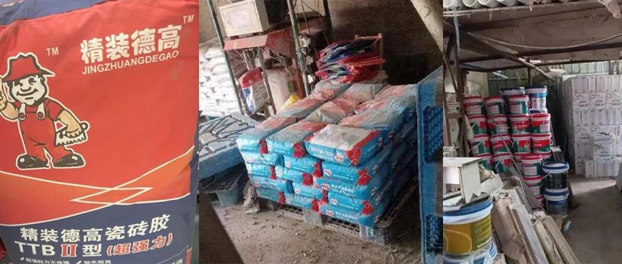 達州宣漢查處1個售假門店,查扣德高克迪聚合背膠32桶,德高克迪瓷磚膠740包。
