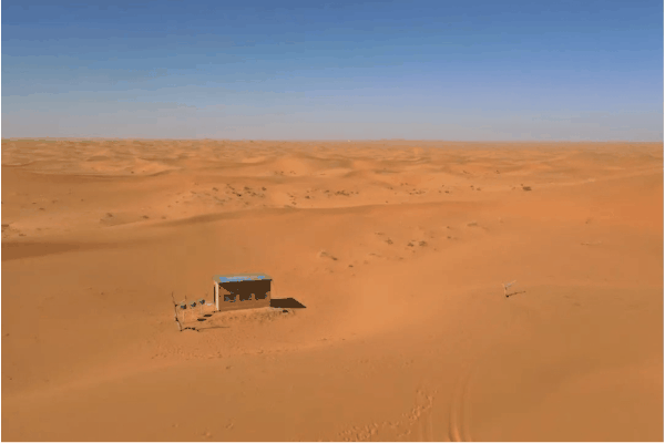 一座綠頂小屋佇立在漫漫黃沙之上